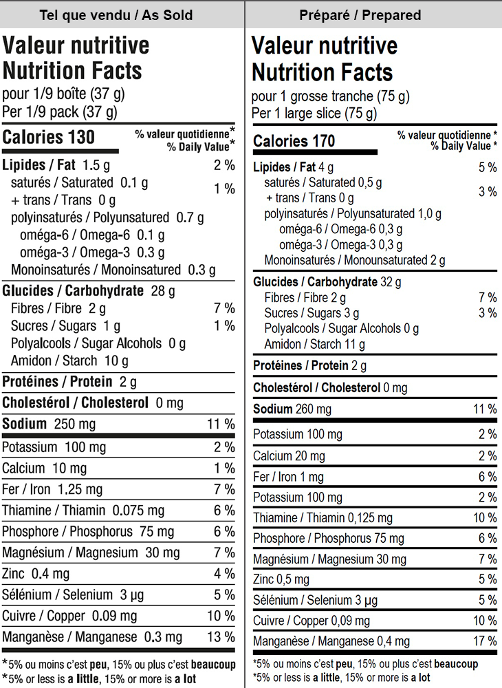 INGRÉDIENTS : MÉLANGE DE FARINES (SORGHO*, MILLET*, QUINOA*), FÉCULE DE TAPIOCA*, FLOCONS (MILLET* ET/OU QUINOA*), LIN MOULU*, POUDRE DE PROTÉINE (CHIA* ET/OU QUINOA* ET/OU LIN*), SEL DE MER, GOMME DE XANTHANE ET/OU GUAR. *BIOLOGIQUE
