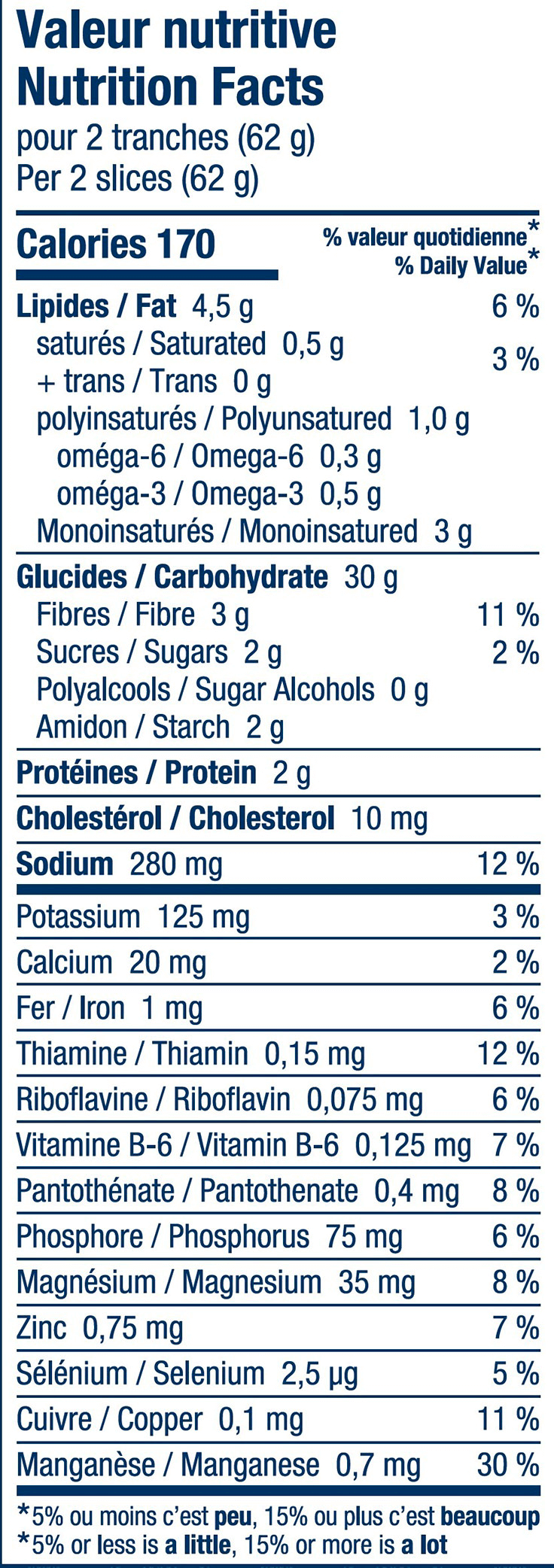 INGRÉDIENTS : EAU, MÉLANGE DE FARINES (RIZ BRUN*, MILLET*, CHIA*, QUINOA*), FÉCULE DE TAPIOCA*, HUILE DE TOURNESOL À TENEUR ÉLEVÉE EN ACIDE OLÉIQUE*, OEUFS ENTIERS CONGELÉS*, SUCRE DE CANNE*, FLOCONS (MILLET* ET/OU QUINOA*), LIN MOULU*, GOMME DE GUAR ET/OU XANTHANE, SEL DE MER, VINAIGRE DE CIDRE*, LEVURE, POUDRE DE PROTÉINE (CHIA* ET/OU QUINOA* ET/OU LIN*). *BIOLOGIQUE